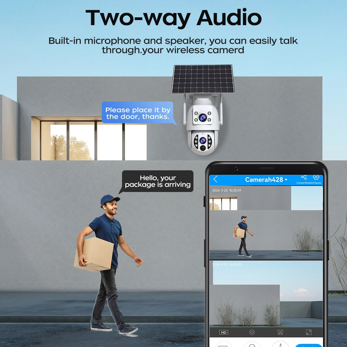 Protege tu hogar con la cámara JOOAN 4MP Solar WiFi de doble lente. Su sistema inalámbrico con batería recargable y panel solar garantiza una vigilancia continua sin necesidad de cables. Perfecta para exteriores, combina alta definición, detección PIR y seguimiento automático inteligente.